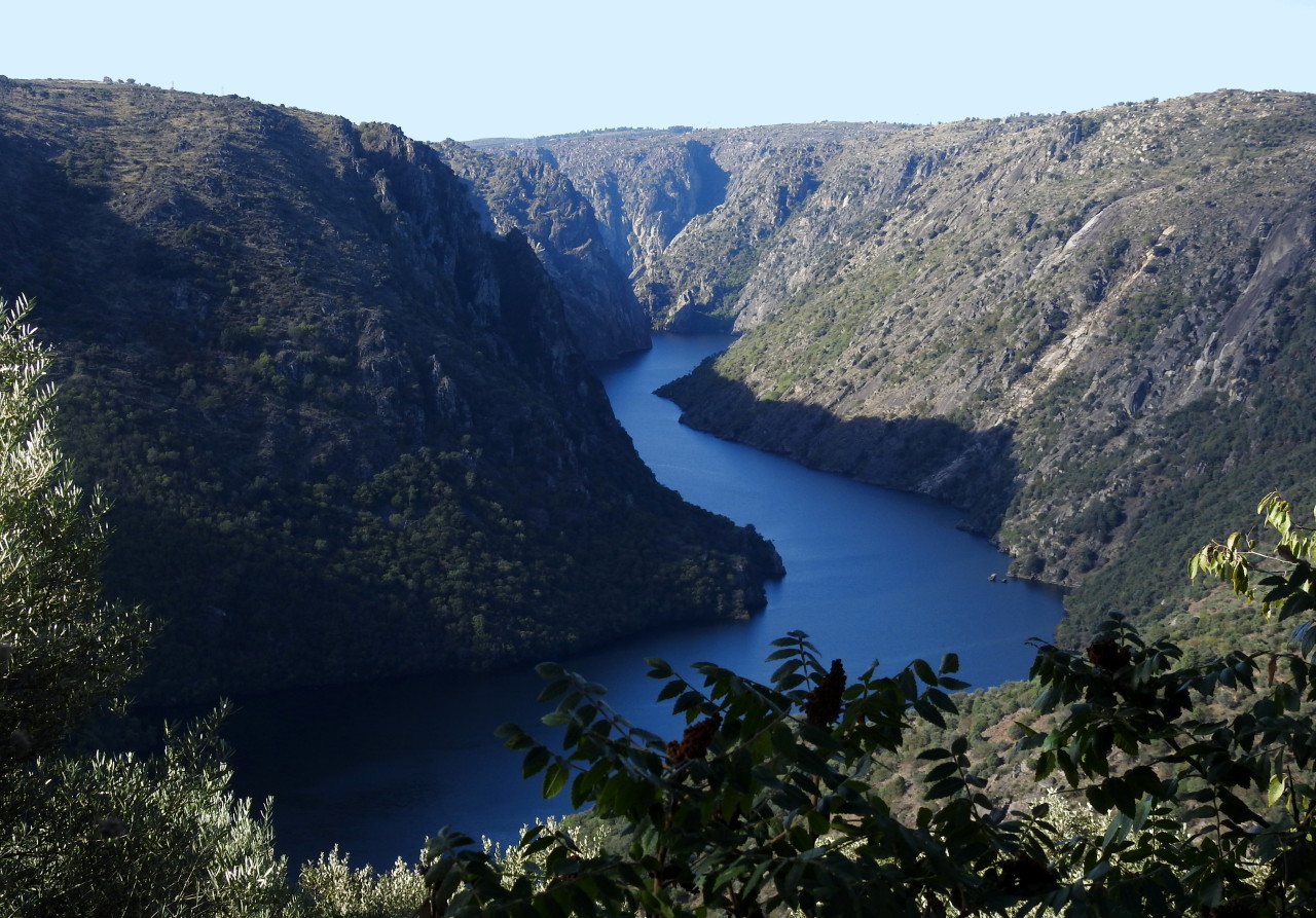 Hermoso paisaje que se muestra ante nosotros ante el que uno se queda absorto, no solo por el entorno sino por la paz y serenidad que se percibe. El río que serpentea por el desfiladero y se pierde al fondo, en el horizonte, tras una de las curvas que realiza en su recorrido, es el que hace de frontera entre países, a la derecha, hacia el este, Portugal, a la izquierda, donde nos encontramos, España... pero la tierra, los ríos y la naturaleza en general no entienden de fronteras, tampoco hay algo físico, tangible, que nos indique si estamos en un sitio o en otro, no se ve desde este punto (más adelante sí) ningún pueblo, ninguna presa, sólo un paisaje espectacular por el que nos vamos a adentrar a partir de ahora, porque esto es lo que hemos venido a ver y a conocer... un cambio brutal de paisaje, pasando de la monótona y algo insulsa penillanura por la que hemos venidos caminando durante cuatro kilómetros a este vertiginoso y abrupto cañón salpicado de zonas boscosas y pequeños tramos de bancales, por el que transcurre el río Duero.